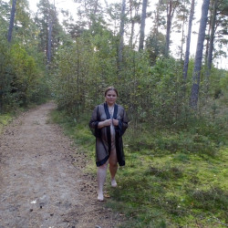 Anna strolls barefoot, almost naked, posing only in a transparent dressing gown and chains with clasps on her swollen nipples.